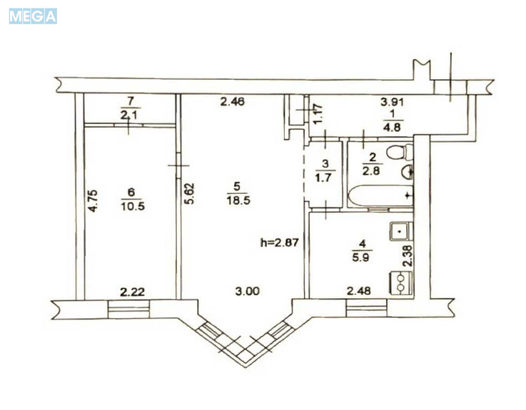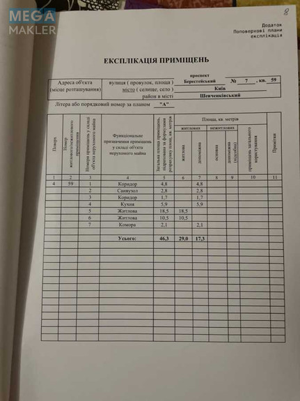Загальна площа - 46,3 кв.м, житлова - 29 кв.м (кімнати 18,5 та 10,5 кв.м), кухня - 5,9 кв.м