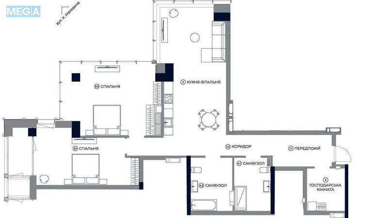 | Площа (загальна/житлова/кухня) | 109/49/29 кв. м |