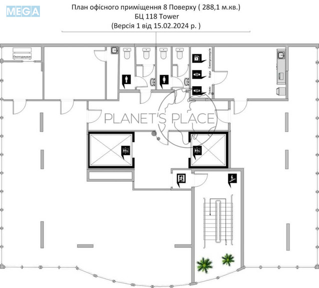 Приміщення складається з: двох великих приміщень для працівників, двох окремих санвузлів, в яких встановлено по дві кабіни, кухні та приміщення для відпочинку з мокрою точкою яке можливо переробити під кухню, роздягальні, кабінету керівника чи переговорної кімнати, серверної кімнати.