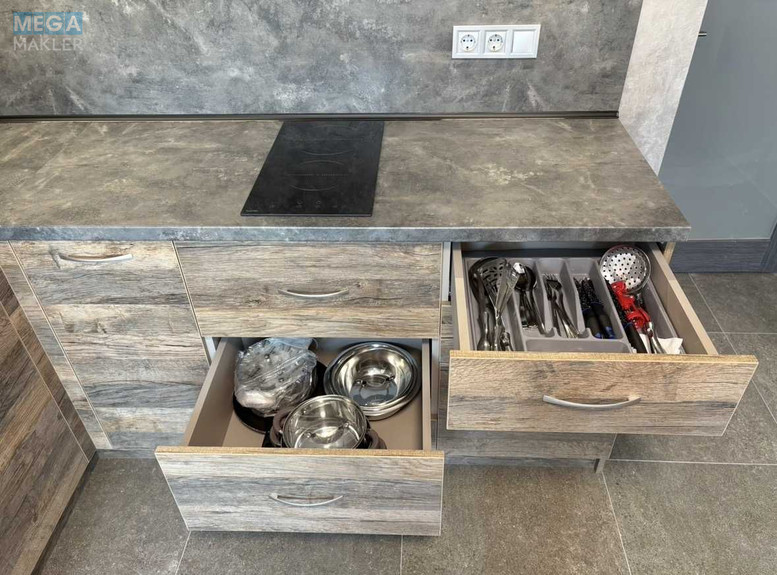 -Вбудована кухня, варильна поверхня, мікрохвильова піч, холодильник, витяжка.