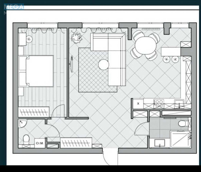 2-кімнатна квартира, загальна площа квартири 61м2, планування суміжно-роздільне (квартира переплановані із 2х роздільних кімнат):
