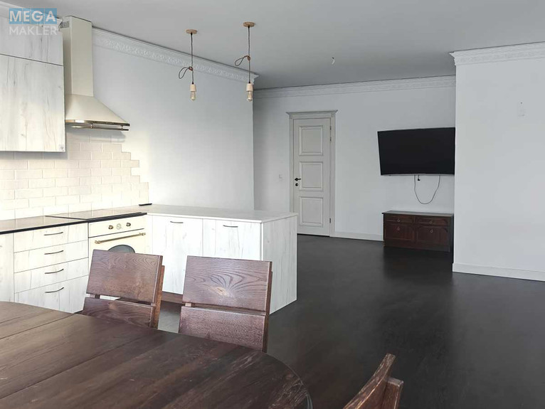 Кухня-вітальня облаштована повноцінною кухнею, великою обідньою зоною та великим телевізором для сімейних вечорів