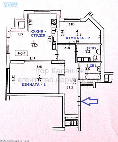 Загальна площа - 75.5, Житлова - 30.2 (19.1+11.1), Кухня - 23 кв.м.