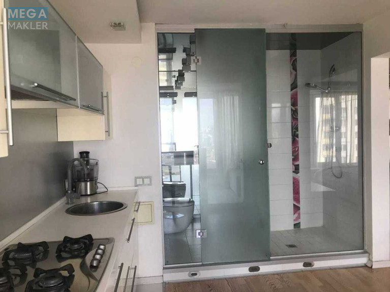 сучасний санвузол зі скляною душовою, з якої також відкривається вид на Київ