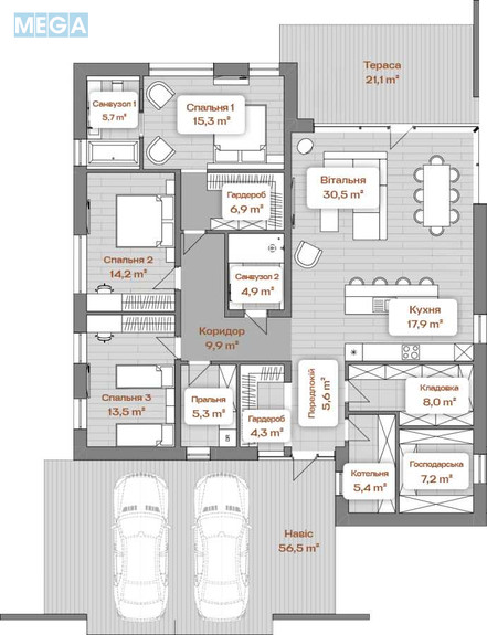 Вітальня (30,5 кв.м), кухня (17,9 кв.м), спальня 1 (15,3 кв.м), спальня 2 (14,2 кв.м), спальня 3 (13,5 кв.м), санвузли (5,7 і 4,9 кв.м), гардеробні (6,9 і 4,3 кв.м), пральня (5,3 кв.м), кладовка (8,0 кв.м), котельня (5,4 кв.м), господарська (7,2 кв.м), передпокій (5,6 кв.м), коридор (9,9 кв.м), тераса (21,1 кв.м), навіс на 2 авто.